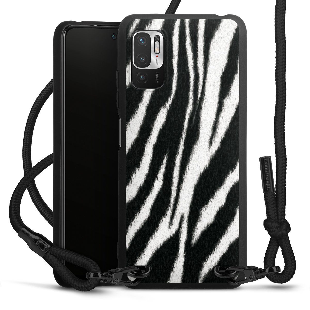 The matt black silicone case is made of flexible TPU (thermoplastic polyurethane) and offers robust protection. The durable, unbreakable material makes the cover flexible and dimensionally stable at the same time. The matte surface makes your design stand out more and is less susceptible to fingerprints and dirt. The stylish trend accessory fits comfortably in the hand and is perfectly complemented by the fabric (polyester) mobile phone strap. The braided fabric strap is approx. 1.70 metres long with a diameter of approx. 0.5 cm. Due to the special knotting technique, the length of the strap can be adjusted by simply pulling it, so that you can adapt it individually to your wishes. The practical case to wear around your neck is available with the fabric strap in black. As a little icing on the cake, we have provided the strap with a chic metal fastener in matt black. The strap is securely fastened to the case with loops made of high-quality genuine leather and press studs. The ends of the fabric strap are covered with metallic end caps and thus protected from fraying.