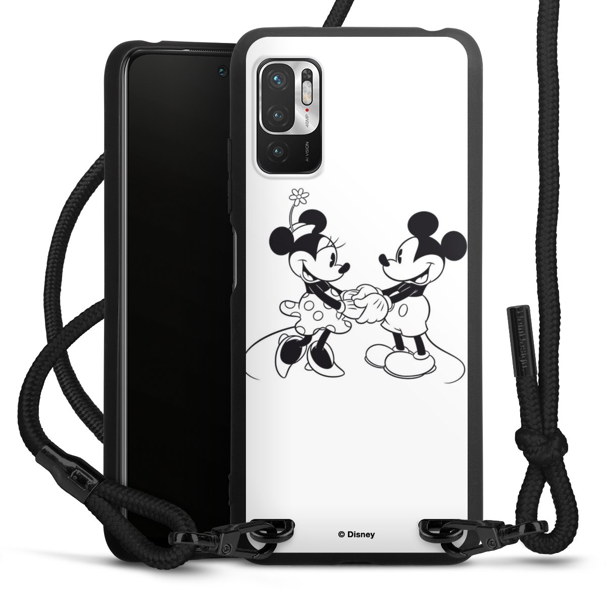The matt black silicone case is made of flexible TPU (thermoplastic polyurethane) and offers robust protection. The durable, unbreakable material makes the cover flexible and dimensionally stable at the same time. The matte surface makes your design stand out more and is less susceptible to fingerprints and dirt. The stylish trend accessory fits comfortably in the hand and is perfectly complemented by the fabric (polyester) mobile phone strap. The braided fabric strap is approx. 1.70 metres long with a diameter of approx. 0.5 cm. Due to the special knotting technique, the length of the strap can be adjusted by simply pulling it, so that you can adapt it individually to your wishes. The practical case to wear around your neck is available with the fabric strap in black. As a little icing on the cake, we have provided the strap with a chic metal fastener in matt black. The strap is securely fastened to the case with loops made of high-quality genuine leather and press studs. The ends of the fabric strap are covered with metallic end caps and thus protected from fraying.