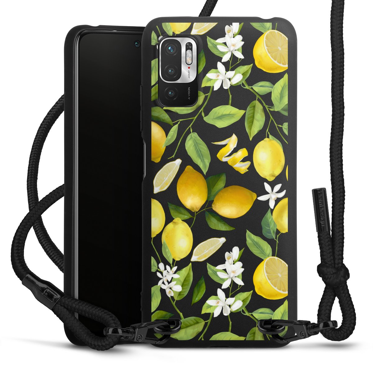 The matt black silicone case is made of flexible TPU (thermoplastic polyurethane) and offers robust protection. The durable, unbreakable material makes the cover flexible and dimensionally stable at the same time. The matte surface makes your design stand out more and is less susceptible to fingerprints and dirt. The stylish trend accessory fits comfortably in the hand and is perfectly complemented by the fabric (polyester) mobile phone strap. The braided fabric strap is approx. 1.70 metres long with a diameter of approx. 0.5 cm. Due to the special knotting technique, the length of the strap can be adjusted by simply pulling it, so that you can adapt it individually to your wishes. The practical case to wear around your neck is available with the fabric strap in black. As a little icing on the cake, we have provided the strap with a chic metal fastener in matt black. The strap is securely fastened to the case with loops made of high-quality genuine leather and press studs. The ends of the fabric strap are covered with metallic end caps and thus protected from fraying.