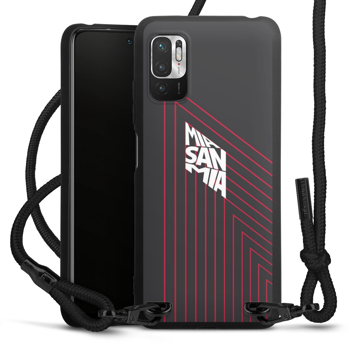The matt black silicone case is made of flexible TPU (thermoplastic polyurethane) and offers robust protection. The durable, unbreakable material makes the cover flexible and dimensionally stable at the same time. The matte surface makes your design stand out more and is less susceptible to fingerprints and dirt. The stylish trend accessory fits comfortably in the hand and is perfectly complemented by the fabric (polyester) mobile phone strap. The braided fabric strap is approx. 1.70 metres long with a diameter of approx. 0.5 cm. Due to the special knotting technique, the length of the strap can be adjusted by simply pulling it, so that you can adapt it individually to your wishes. The practical case to wear around your neck is available with the fabric strap in black. As a little icing on the cake, we have provided the strap with a chic metal fastener in matt black. The strap is securely fastened to the case with loops made of high-quality genuine leather and press studs. The ends of the fabric strap are covered with metallic end caps and thus protected from fraying.