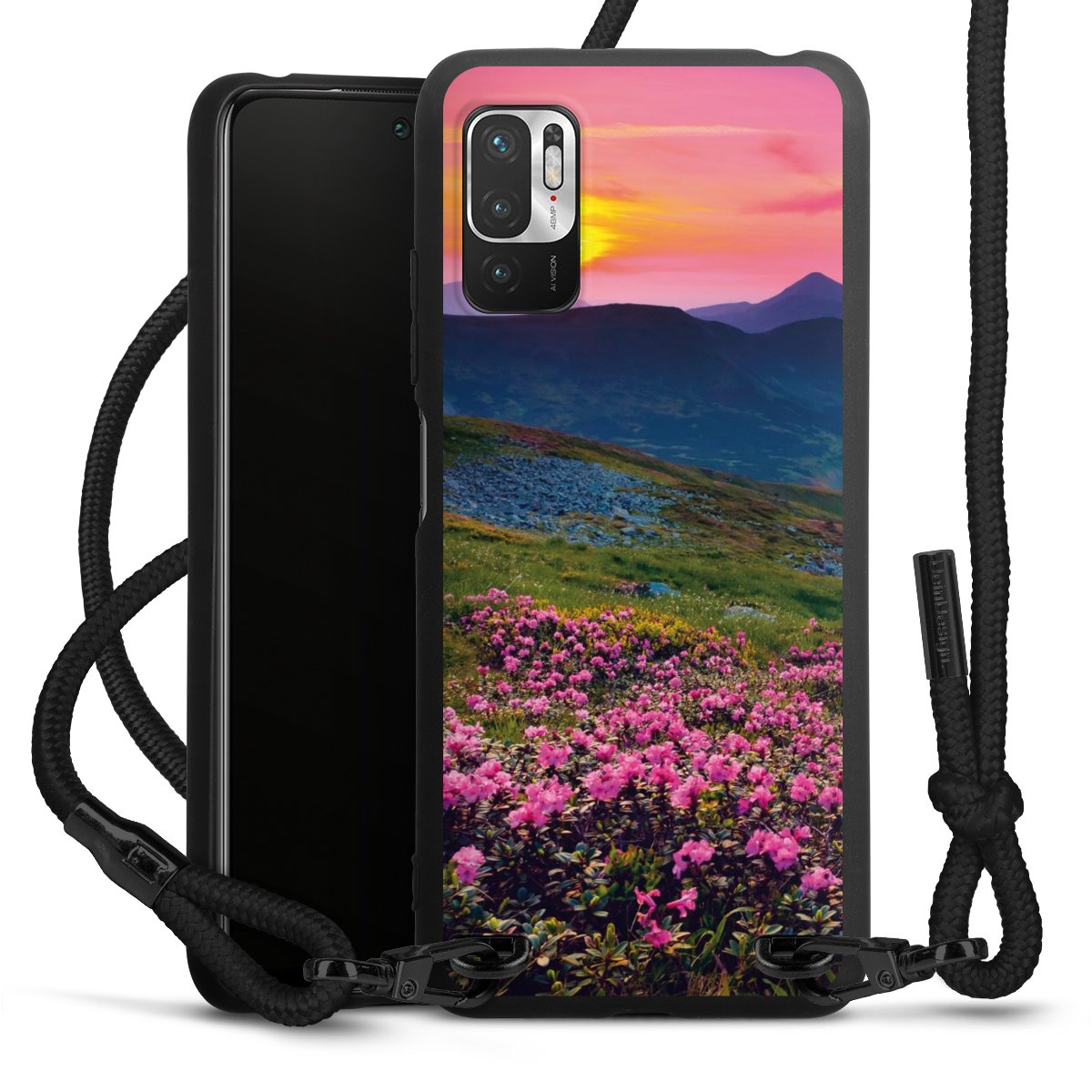 The matt black silicone case is made of flexible TPU (thermoplastic polyurethane) and offers robust protection. The durable, unbreakable material makes the cover flexible and dimensionally stable at the same time. The matte surface makes your design stand out more and is less susceptible to fingerprints and dirt. The stylish trend accessory fits comfortably in the hand and is perfectly complemented by the fabric (polyester) mobile phone strap. The braided fabric strap is approx. 1.70 metres long with a diameter of approx. 0.5 cm. Due to the special knotting technique, the length of the strap can be adjusted by simply pulling it, so that you can adapt it individually to your wishes. The practical case to wear around your neck is available with the fabric strap in black. As a little icing on the cake, we have provided the strap with a chic metal fastener in matt black. The strap is securely fastened to the case with loops made of high-quality genuine leather and press studs. The ends of the fabric strap are covered with metallic end caps and thus protected from fraying.