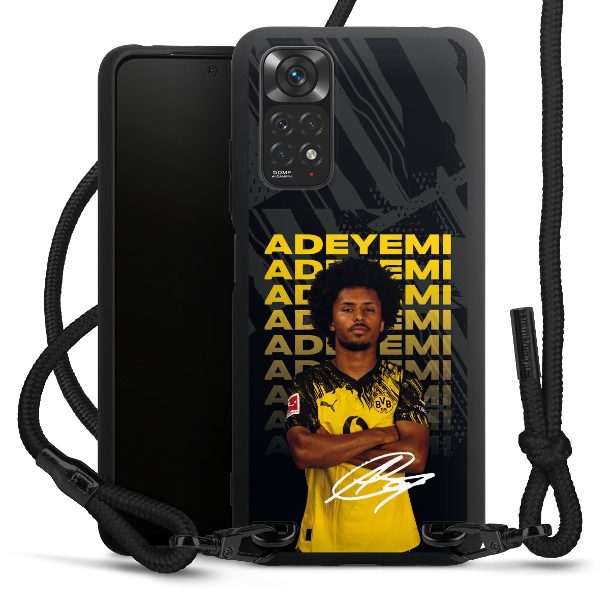 The matt black silicone case is made of flexible TPU (thermoplastic polyurethane) and offers robust protection. The durable, unbreakable material makes the cover flexible and dimensionally stable at the same time. The matte surface makes your design stand out more and is less susceptible to fingerprints and dirt. The stylish trend accessory fits comfortably in the hand and is perfectly complemented by the fabric (polyester) mobile phone strap. The braided fabric strap is approx. 1.70 metres long with a diameter of approx. 0.5 cm. Due to the special knotting technique, the length of the strap can be adjusted by simply pulling it, so that you can adapt it individually to your wishes. The practical case to wear around your neck is available with the fabric strap in black. As a little icing on the cake, we have provided the strap with a chic metal fastener in matt black. The strap is securely fastened to the case with loops made of high-quality genuine leather and press studs. The ends of the fabric strap are covered with metallic end caps and thus protected from fraying.