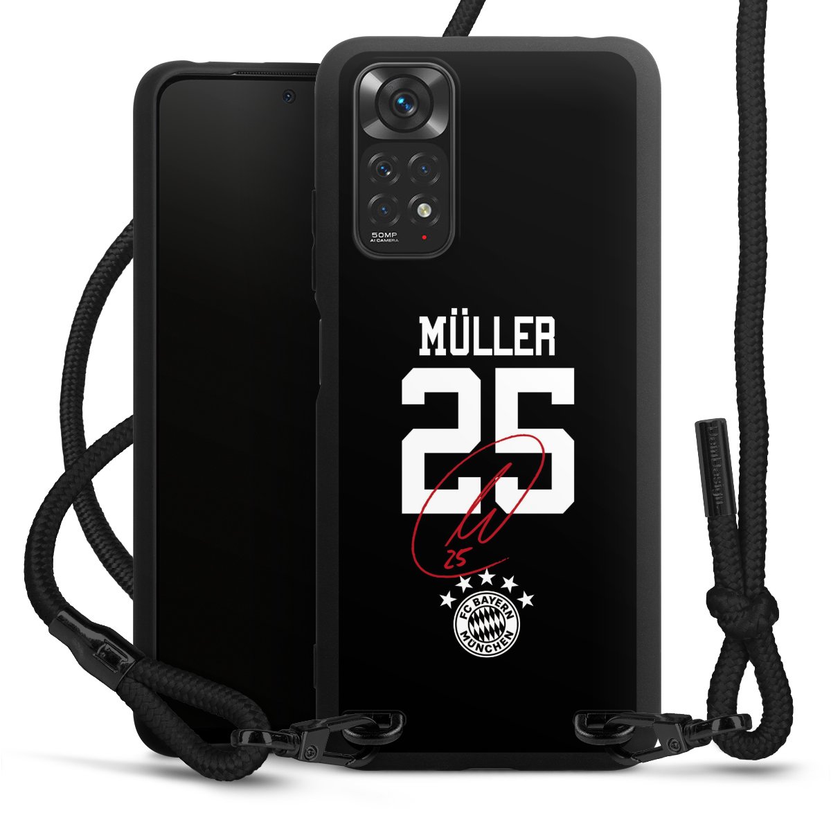 The matt black silicone case is made of flexible TPU (thermoplastic polyurethane) and offers robust protection. The durable, unbreakable material makes the cover flexible and dimensionally stable at the same time. The matte surface makes your design stand out more and is less susceptible to fingerprints and dirt. The stylish trend accessory fits comfortably in the hand and is perfectly complemented by the fabric (polyester) mobile phone strap. The braided fabric strap is approx. 1.70 metres long with a diameter of approx. 0.5 cm. Due to the special knotting technique, the length of the strap can be adjusted by simply pulling it, so that you can adapt it individually to your wishes. The practical case to wear around your neck is available with the fabric strap in black. As a little icing on the cake, we have provided the strap with a chic metal fastener in matt black. The strap is securely fastened to the case with loops made of high-quality genuine leather and press studs. The ends of the fabric strap are covered with metallic end caps and thus protected from fraying.