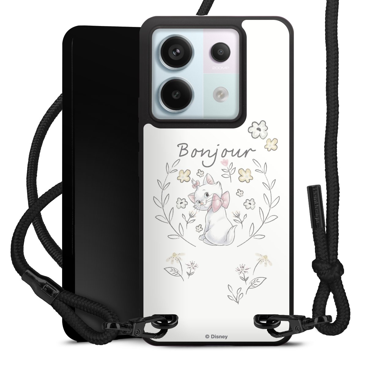 The matt black silicone case is made of flexible TPU (thermoplastic polyurethane) and offers robust protection. The durable, unbreakable material makes the cover flexible and dimensionally stable at the same time. The matte surface makes your design stand out more and is less susceptible to fingerprints and dirt. The stylish trend accessory fits comfortably in the hand and is perfectly complemented by the fabric (polyester) mobile phone strap. The braided fabric strap is approx. 1.70 metres long with a diameter of approx. 0.5 cm. Due to the special knotting technique, the length of the strap can be adjusted by simply pulling it, so that you can adapt it individually to your wishes. The practical case to wear around your neck is available with the fabric strap in black. As a little icing on the cake, we have provided the strap with a chic metal fastener in matt black. The strap is securely fastened to the case with loops made of high-quality genuine leather and press studs. The ends of the fabric strap are covered with metallic end caps and thus protected from fraying.