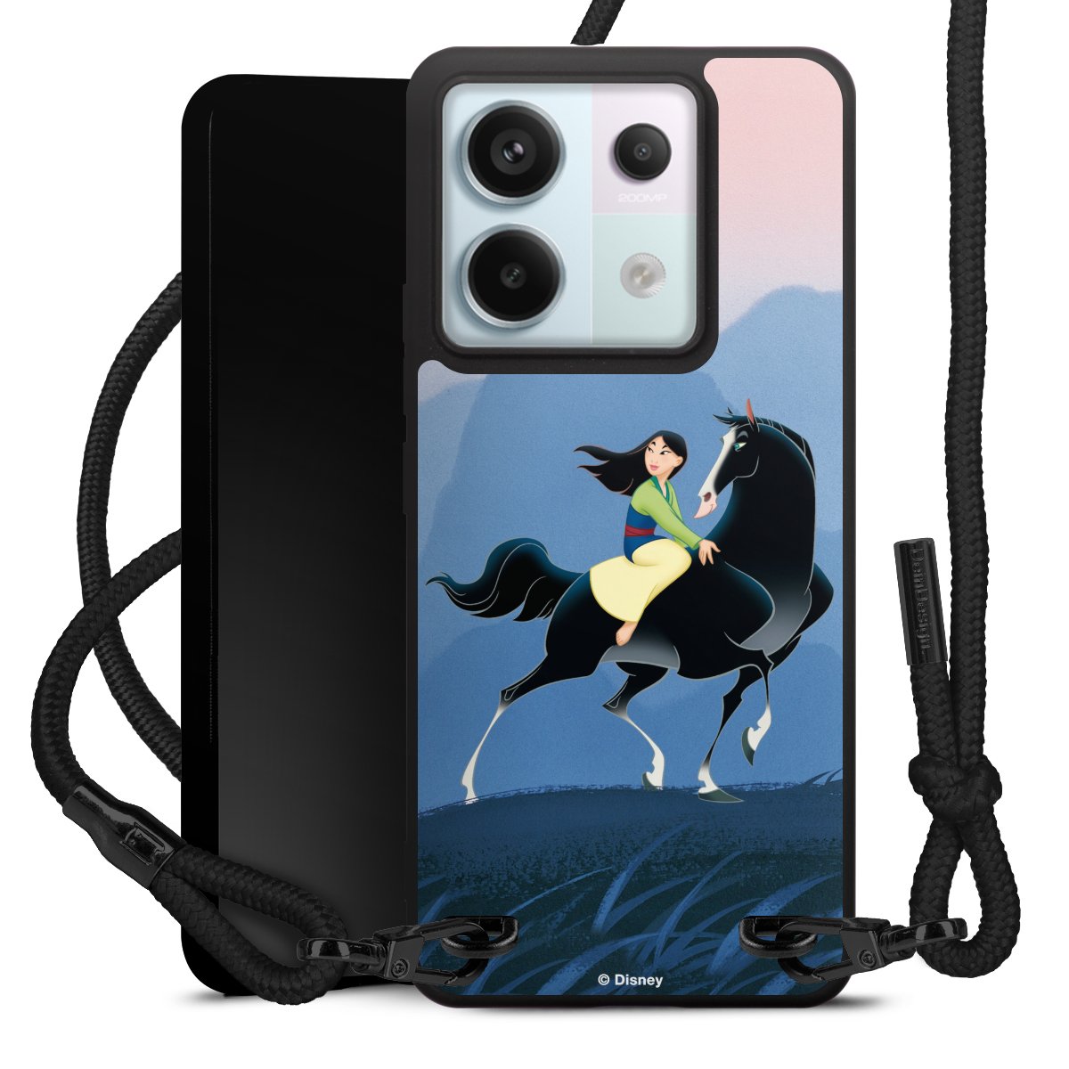 The matt black silicone case is made of flexible TPU (thermoplastic polyurethane) and offers robust protection. The durable, unbreakable material makes the cover flexible and dimensionally stable at the same time. The matte surface makes your design stand out more and is less susceptible to fingerprints and dirt. The stylish trend accessory fits comfortably in the hand and is perfectly complemented by the fabric (polyester) mobile phone strap. The braided fabric strap is approx. 1.70 metres long with a diameter of approx. 0.5 cm. Due to the special knotting technique, the length of the strap can be adjusted by simply pulling it, so that you can adapt it individually to your wishes. The practical case to wear around your neck is available with the fabric strap in black. As a little icing on the cake, we have provided the strap with a chic metal fastener in matt black. The strap is securely fastened to the case with loops made of high-quality genuine leather and press studs. The ends of the fabric strap are covered with metallic end caps and thus protected from fraying.