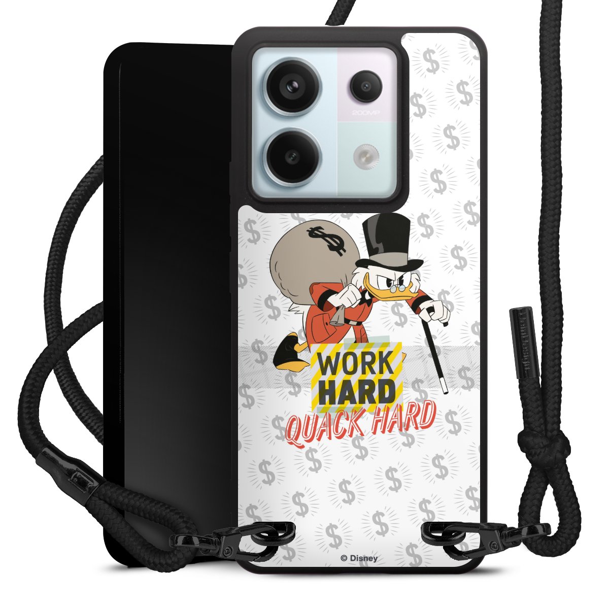 The matt black silicone case is made of flexible TPU (thermoplastic polyurethane) and offers robust protection. The durable, unbreakable material makes the cover flexible and dimensionally stable at the same time. The matte surface makes your design stand out more and is less susceptible to fingerprints and dirt. The stylish trend accessory fits comfortably in the hand and is perfectly complemented by the fabric (polyester) mobile phone strap. The braided fabric strap is approx. 1.70 metres long with a diameter of approx. 0.5 cm. Due to the special knotting technique, the length of the strap can be adjusted by simply pulling it, so that you can adapt it individually to your wishes. The practical case to wear around your neck is available with the fabric strap in black. As a little icing on the cake, we have provided the strap with a chic metal fastener in matt black. The strap is securely fastened to the case with loops made of high-quality genuine leather and press studs. The ends of the fabric strap are covered with metallic end caps and thus protected from fraying.