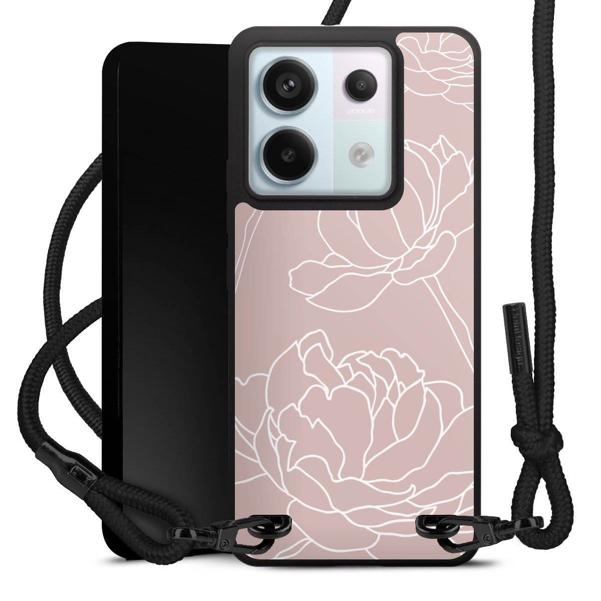The matt black silicone case is made of flexible TPU (thermoplastic polyurethane) and offers robust protection. The durable, unbreakable material makes the cover flexible and dimensionally stable at the same time. The matte surface makes your design stand out more and is less susceptible to fingerprints and dirt. The stylish trend accessory fits comfortably in the hand and is perfectly complemented by the fabric (polyester) mobile phone strap. The braided fabric strap is approx. 1.70 metres long with a diameter of approx. 0.5 cm. Due to the special knotting technique, the length of the strap can be adjusted by simply pulling it, so that you can adapt it individually to your wishes. The practical case to wear around your neck is available with the fabric strap in black. As a little icing on the cake, we have provided the strap with a chic metal fastener in matt black. The strap is securely fastened to the case with loops made of high-quality genuine leather and press studs. The ends of the fabric strap are covered with metallic end caps and thus protected from fraying.