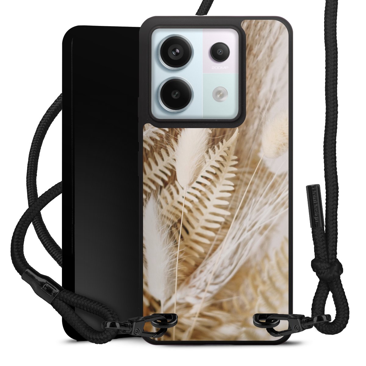 The matt black silicone case is made of flexible TPU (thermoplastic polyurethane) and offers robust protection. The durable, unbreakable material makes the cover flexible and dimensionally stable at the same time. The matte surface makes your design stand out more and is less susceptible to fingerprints and dirt. The stylish trend accessory fits comfortably in the hand and is perfectly complemented by the fabric (polyester) mobile phone strap. The braided fabric strap is approx. 1.70 metres long with a diameter of approx. 0.5 cm. Due to the special knotting technique, the length of the strap can be adjusted by simply pulling it, so that you can adapt it individually to your wishes. The practical case to wear around your neck is available with the fabric strap in black. As a little icing on the cake, we have provided the strap with a chic metal fastener in matt black. The strap is securely fastened to the case with loops made of high-quality genuine leather and press studs. The ends of the fabric strap are covered with metallic end caps and thus protected from fraying.