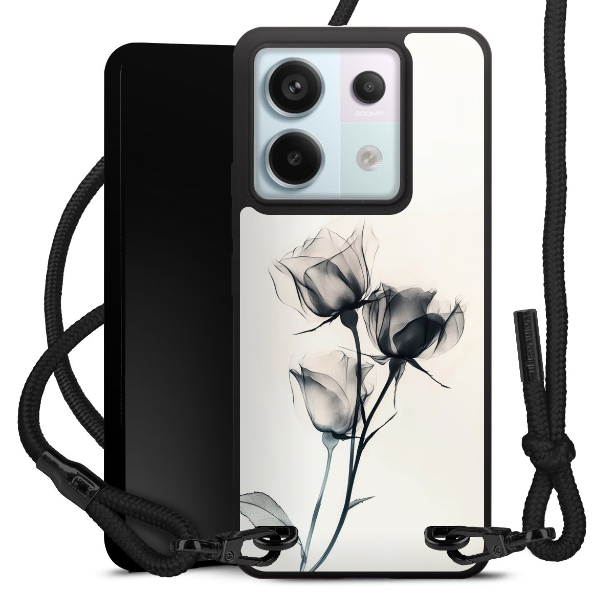 The matt black silicone case is made of flexible TPU (thermoplastic polyurethane) and offers robust protection. The durable, unbreakable material makes the cover flexible and dimensionally stable at the same time. The matte surface makes your design stand out more and is less susceptible to fingerprints and dirt. The stylish trend accessory fits comfortably in the hand and is perfectly complemented by the fabric (polyester) mobile phone strap. The braided fabric strap is approx. 1.70 metres long with a diameter of approx. 0.5 cm. Due to the special knotting technique, the length of the strap can be adjusted by simply pulling it, so that you can adapt it individually to your wishes. The practical case to wear around your neck is available with the fabric strap in black. As a little icing on the cake, we have provided the strap with a chic metal fastener in matt black. The strap is securely fastened to the case with loops made of high-quality genuine leather and press studs. The ends of the fabric strap are covered with metallic end caps and thus protected from fraying.