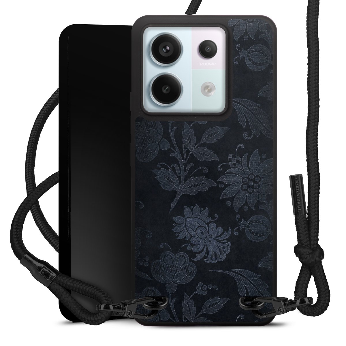 The matt black silicone case is made of flexible TPU (thermoplastic polyurethane) and offers robust protection. The durable, unbreakable material makes the cover flexible and dimensionally stable at the same time. The matte surface makes your design stand out more and is less susceptible to fingerprints and dirt. The stylish trend accessory fits comfortably in the hand and is perfectly complemented by the fabric (polyester) mobile phone strap. The braided fabric strap is approx. 1.70 metres long with a diameter of approx. 0.5 cm. Due to the special knotting technique, the length of the strap can be adjusted by simply pulling it, so that you can adapt it individually to your wishes. The practical case to wear around your neck is available with the fabric strap in black. As a little icing on the cake, we have provided the strap with a chic metal fastener in matt black. The strap is securely fastened to the case with loops made of high-quality genuine leather and press studs. The ends of the fabric strap are covered with metallic end caps and thus protected from fraying.