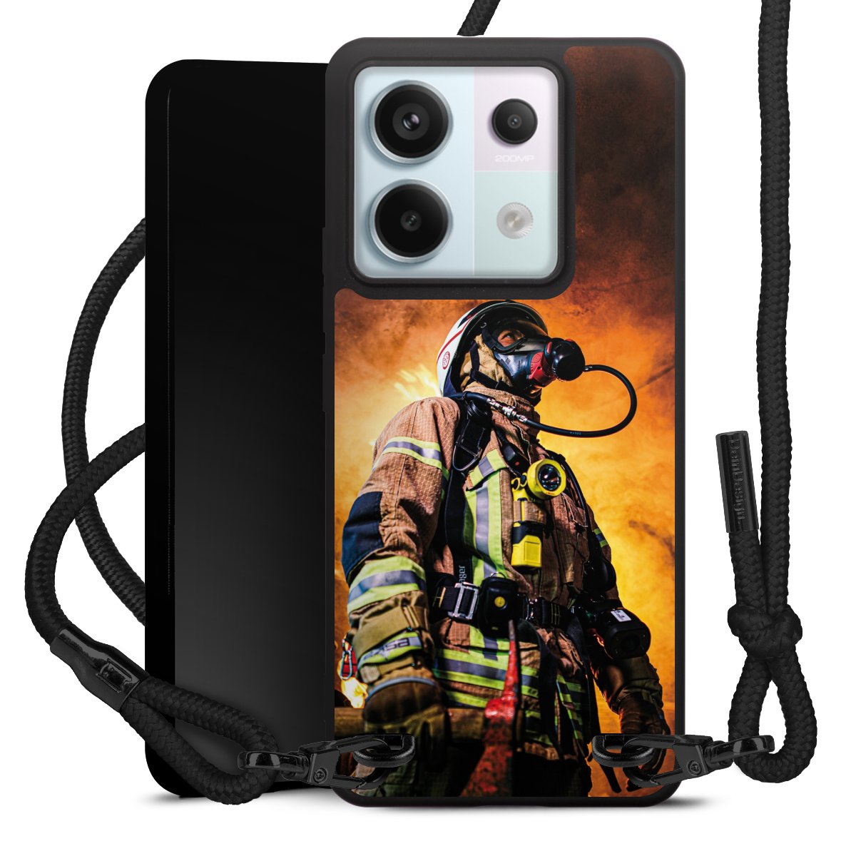 The matt black silicone case is made of flexible TPU (thermoplastic polyurethane) and offers robust protection. The durable, unbreakable material makes the cover flexible and dimensionally stable at the same time. The matte surface makes your design stand out more and is less susceptible to fingerprints and dirt. The stylish trend accessory fits comfortably in the hand and is perfectly complemented by the fabric (polyester) mobile phone strap. The braided fabric strap is approx. 1.70 metres long with a diameter of approx. 0.5 cm. Due to the special knotting technique, the length of the strap can be adjusted by simply pulling it, so that you can adapt it individually to your wishes. The practical case to wear around your neck is available with the fabric strap in black. As a little icing on the cake, we have provided the strap with a chic metal fastener in matt black. The strap is securely fastened to the case with loops made of high-quality genuine leather and press studs. The ends of the fabric strap are covered with metallic end caps and thus protected from fraying.
