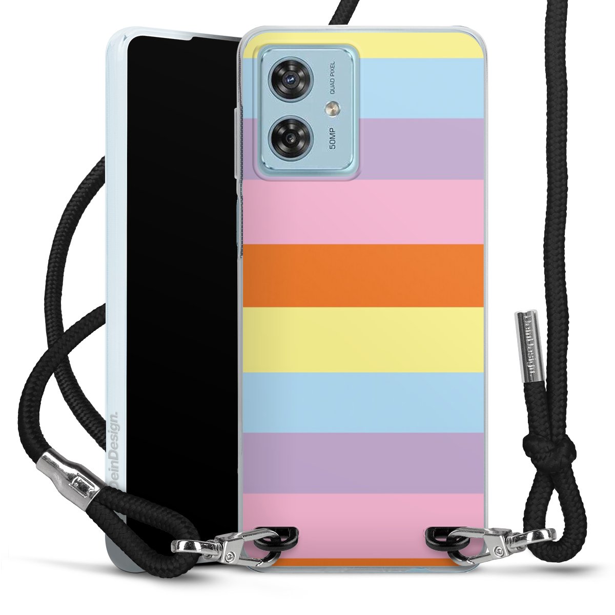 The flexible case is made from a high quality TPU material (thermoplastic Polyurethan). Thanks to its long-lasting and break resistant characteristics, the case is flexible yet consistent in form and has a great grip and feel. The textile strap made from Polyester gives a chic yet casual accent allowing you to carry your phone like a bag or necklace - a practical gadget perfect for your next adventure. The textile strap is about 1.70 meters long and the length can easily be adjusted through the knots. Our Carry Case is available in black, red, pink, grey, mustard, dark green and royal blue. We added a metal fastening to give the product an elegant touch. The ends of the textile strap are covered with metallic end caps to protect them against fraying.
