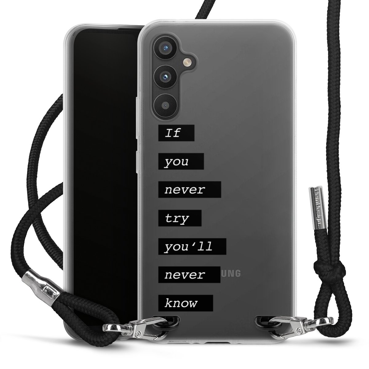 For our Carry Case we are using our advanced direct printing technology. The backside is fully printable, the frame is left unprinted. You can order the phone case without print, printed completely or also with a partial print. Choose one of our exclusive, pre-made shop designs or let your creativity shine and create your very own unique design with your pictures, overlays and text.
