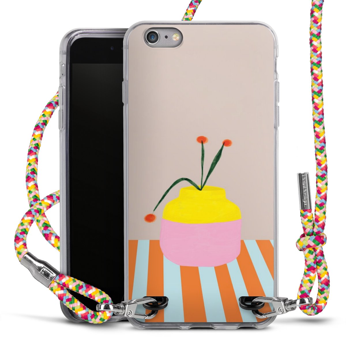 The flexible case is made from a highquality TPU material (thermoplastic Polyurethan). Thanks to its longlasting and break resistant characterisitcs, the case is flexible yet consistent in form and has a great grip and feel. The textile strap made from Polyester gives a chic yet casual accent allowing you to carry your phone like a bag or necklace - a practical gadget perfect for your next adventure. The textile strap is about 1.70 meters long and the length can easily be adjusted through the knots. Our Carry Case is available in Colourful, Mint-Camouflage, Very-Berry, Sahara-Sand and Sparkling-Neon. The ends of the textile strap are covered with metallic end caps to protect them against fraying.