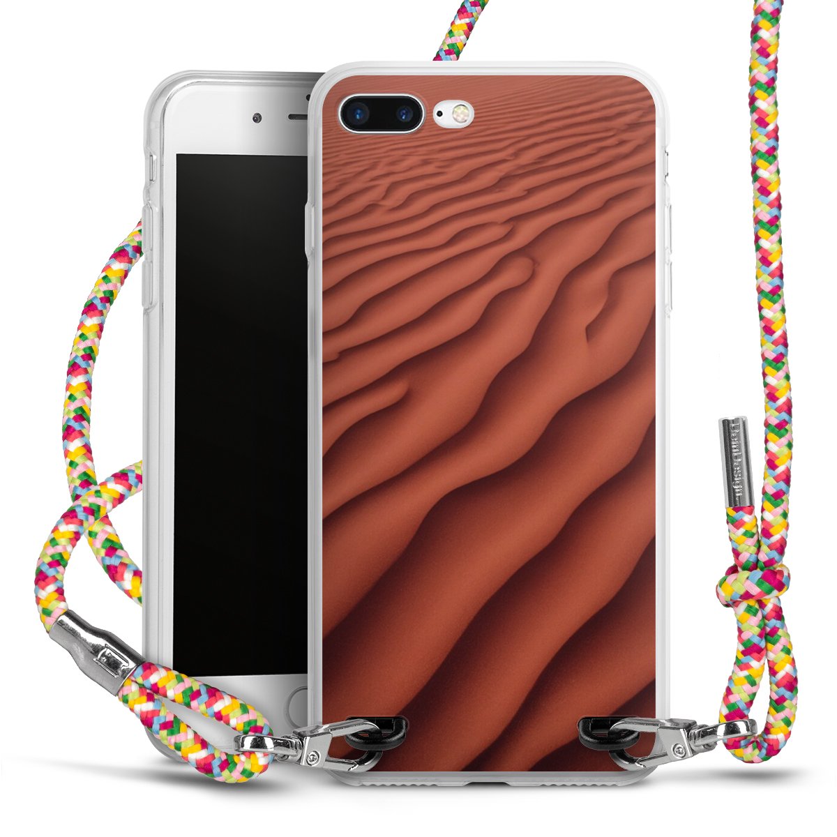 The flexible case is made from a highquality TPU material (thermoplastic Polyurethan). Thanks to its longlasting and break resistant characterisitcs, the case is flexible yet consistent in form and has a great grip and feel. The textile strap made from Polyester gives a chic yet casual accent allowing you to carry your phone like a bag or necklace - a practical gadget perfect for your next adventure. The textile strap is about 1.70 meters long and the length can easily be adjusted through the knots. Our Carry Case is available in Colourful, Mint-Camouflage, Very-Berry, Sahara-Sand and Sparkling-Neon. The ends of the textile strap are covered with metallic end caps to protect them against fraying.