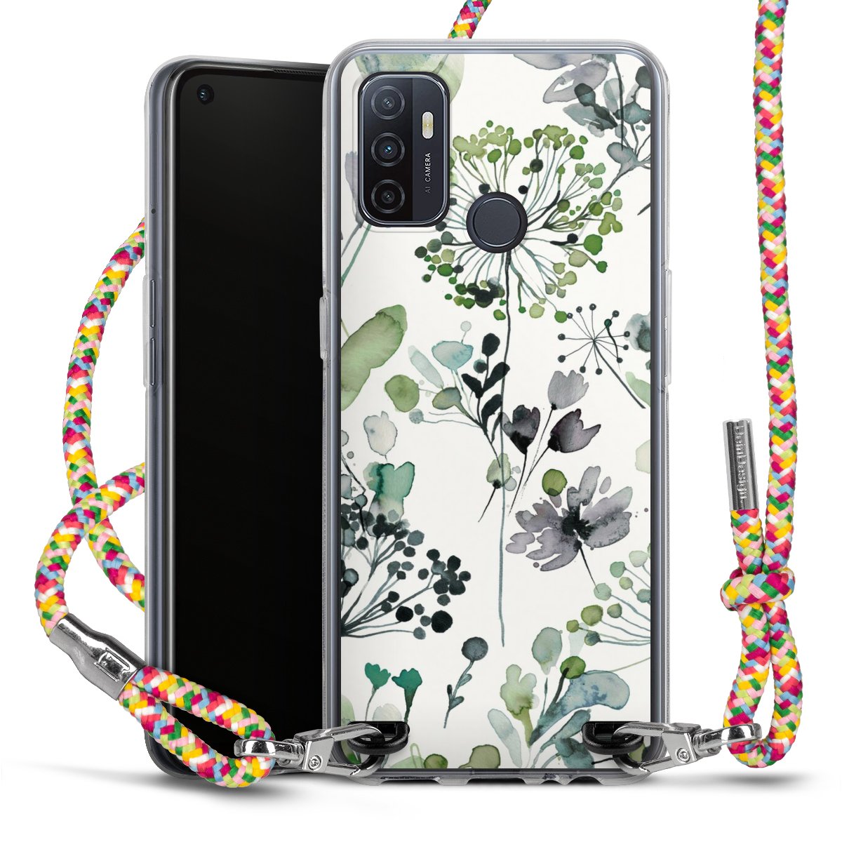 The flexible case is made from a highquality TPU material (thermoplastic Polyurethan). Thanks to its longlasting and break resistant characterisitcs, the case is flexible yet consistent in form and has a great grip and feel. The textile strap made from Polyester gives a chic yet casual accent allowing you to carry your phone like a bag or necklace - a practical gadget perfect for your next adventure. The textile strap is about 1.70 meters long and the length can easily be adjusted through the knots. Our Carry Case is available in Colourful, Mint-Camouflage, Very-Berry, Sahara-Sand and Sparkling-Neon. The ends of the textile strap are covered with metallic end caps to protect them against fraying.