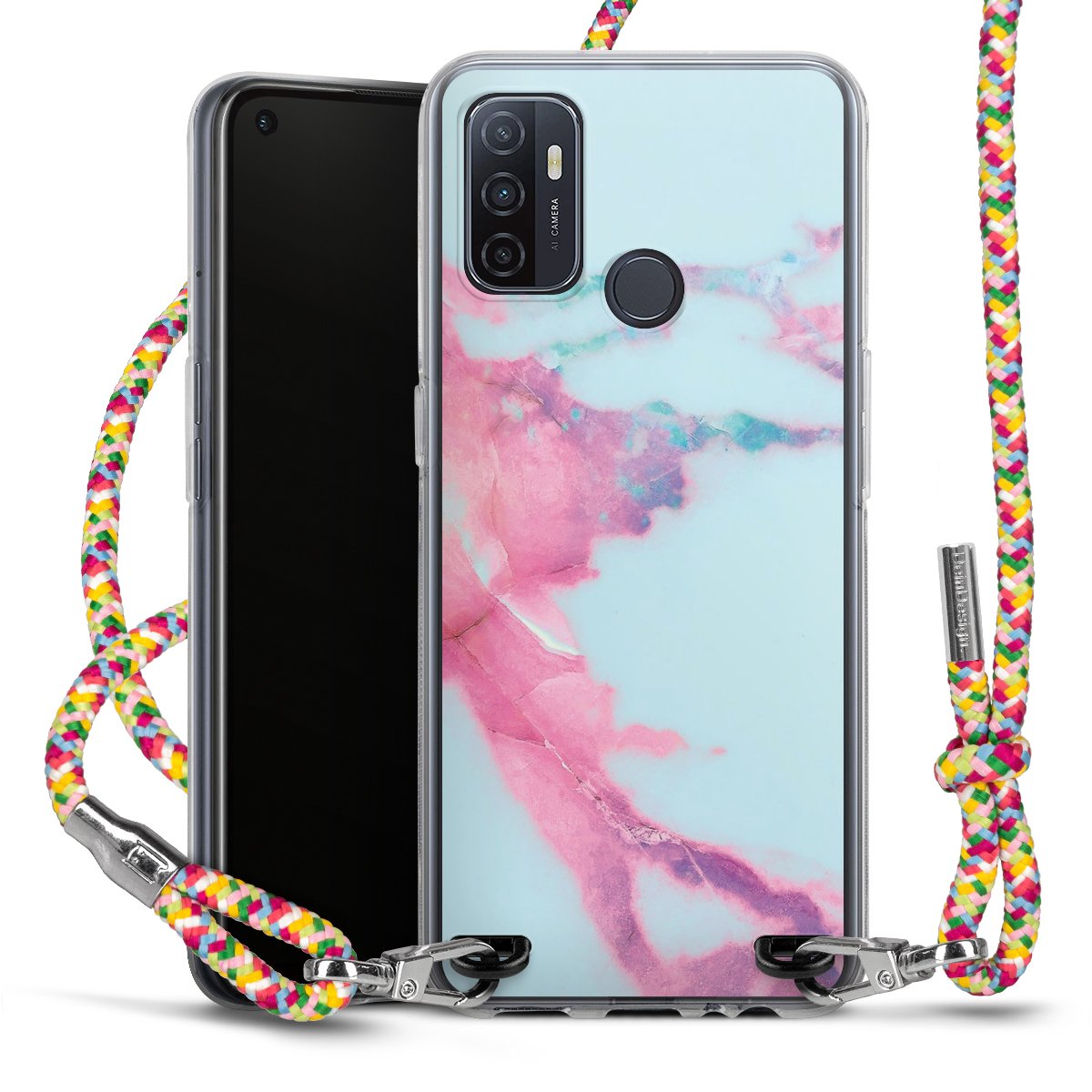 The flexible case is made from a highquality TPU material (thermoplastic Polyurethan). Thanks to its longlasting and break resistant characterisitcs, the case is flexible yet consistent in form and has a great grip and feel. The textile strap made from Polyester gives a chic yet casual accent allowing you to carry your phone like a bag or necklace - a practical gadget perfect for your next adventure. The textile strap is about 1.70 meters long and the length can easily be adjusted through the knots. Our Carry Case is available in Colourful, Mint-Camouflage, Very-Berry, Sahara-Sand and Sparkling-Neon. The ends of the textile strap are covered with metallic end caps to protect them against fraying.