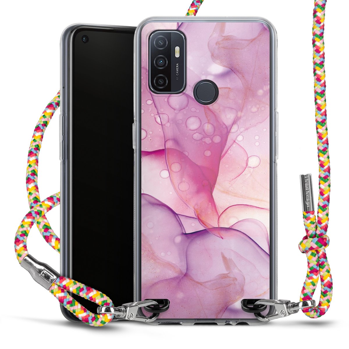 The flexible case is made from a highquality TPU material (thermoplastic Polyurethan). Thanks to its longlasting and break resistant characterisitcs, the case is flexible yet consistent in form and has a great grip and feel. The textile strap made from Polyester gives a chic yet casual accent allowing you to carry your phone like a bag or necklace - a practical gadget perfect for your next adventure. The textile strap is about 1.70 meters long and the length can easily be adjusted through the knots. Our Carry Case is available in Colourful, Mint-Camouflage, Very-Berry, Sahara-Sand and Sparkling-Neon. The ends of the textile strap are covered with metallic end caps to protect them against fraying.