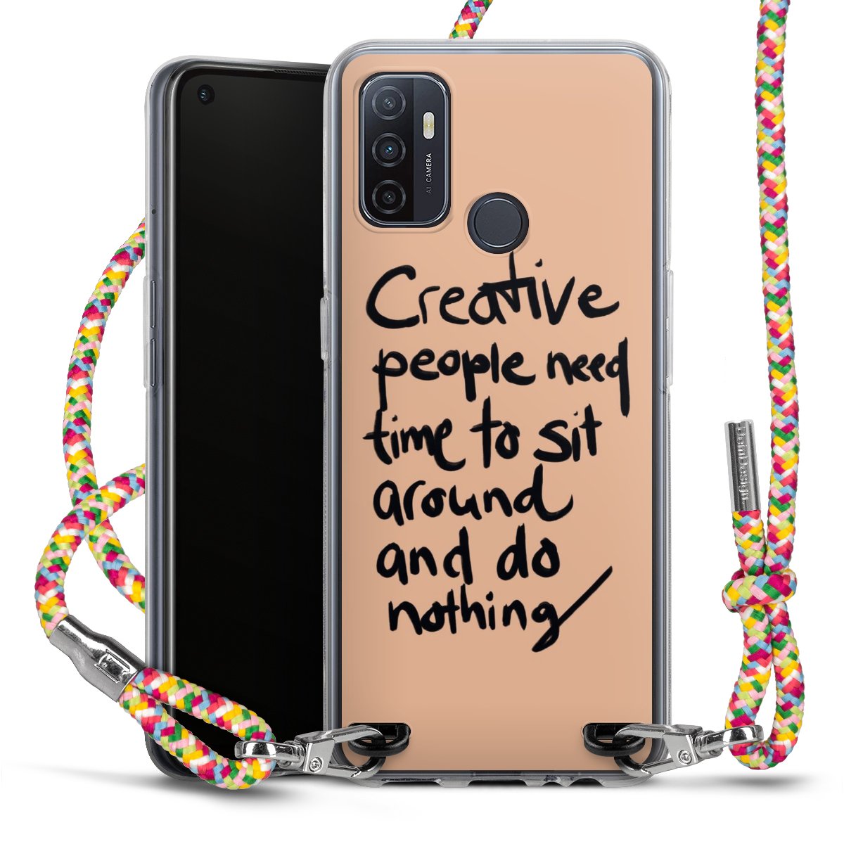 The flexible case is made from a highquality TPU material (thermoplastic Polyurethan). Thanks to its longlasting and break resistant characterisitcs, the case is flexible yet consistent in form and has a great grip and feel. The textile strap made from Polyester gives a chic yet casual accent allowing you to carry your phone like a bag or necklace - a practical gadget perfect for your next adventure. The textile strap is about 1.70 meters long and the length can easily be adjusted through the knots. Our Carry Case is available in Colourful, Mint-Camouflage, Very-Berry, Sahara-Sand and Sparkling-Neon. The ends of the textile strap are covered with metallic end caps to protect them against fraying.