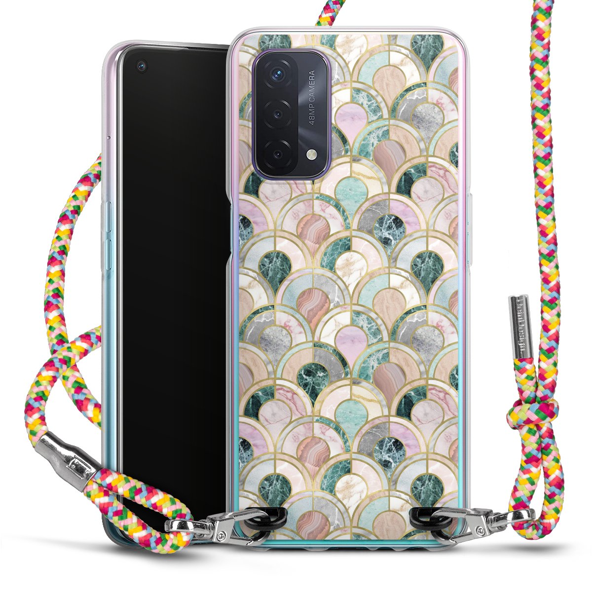 The flexible case is made from a highquality TPU material (thermoplastic Polyurethan). Thanks to its longlasting and break resistant characterisitcs, the case is flexible yet consistent in form and has a great grip and feel. The textile strap made from Polyester gives a chic yet casual accent allowing you to carry your phone like a bag or necklace - a practical gadget perfect for your next adventure. The textile strap is about 1.70 meters long and the length can easily be adjusted through the knots. Our Carry Case is available in Colourful, Mint-Camouflage, Very-Berry, Sahara-Sand and Sparkling-Neon. The ends of the textile strap are covered with metallic end caps to protect them against fraying.