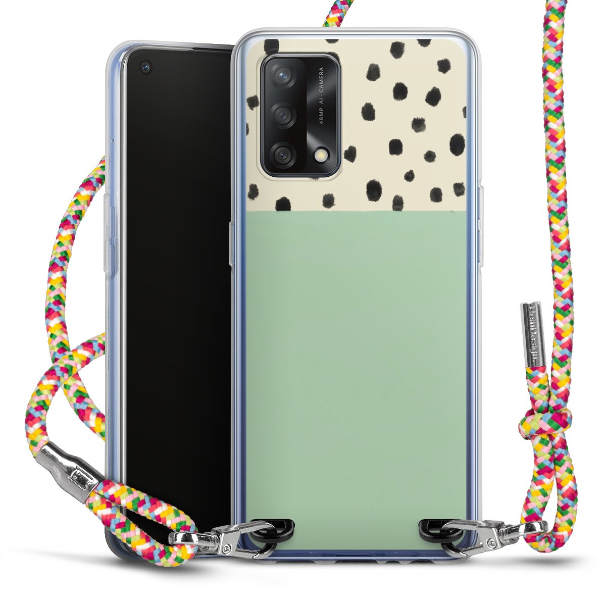 The flexible case is made from a highquality TPU material (thermoplastic Polyurethan). Thanks to its longlasting and break resistant characterisitcs, the case is flexible yet consistent in form and has a great grip and feel. The textile strap made from Polyester gives a chic yet casual accent allowing you to carry your phone like a bag or necklace - a practical gadget perfect for your next adventure. The textile strap is about 1.70 meters long and the length can easily be adjusted through the knots. Our Carry Case is available in Colourful, Mint-Camouflage, Very-Berry, Sahara-Sand and Sparkling-Neon. The ends of the textile strap are covered with metallic end caps to protect them against fraying.