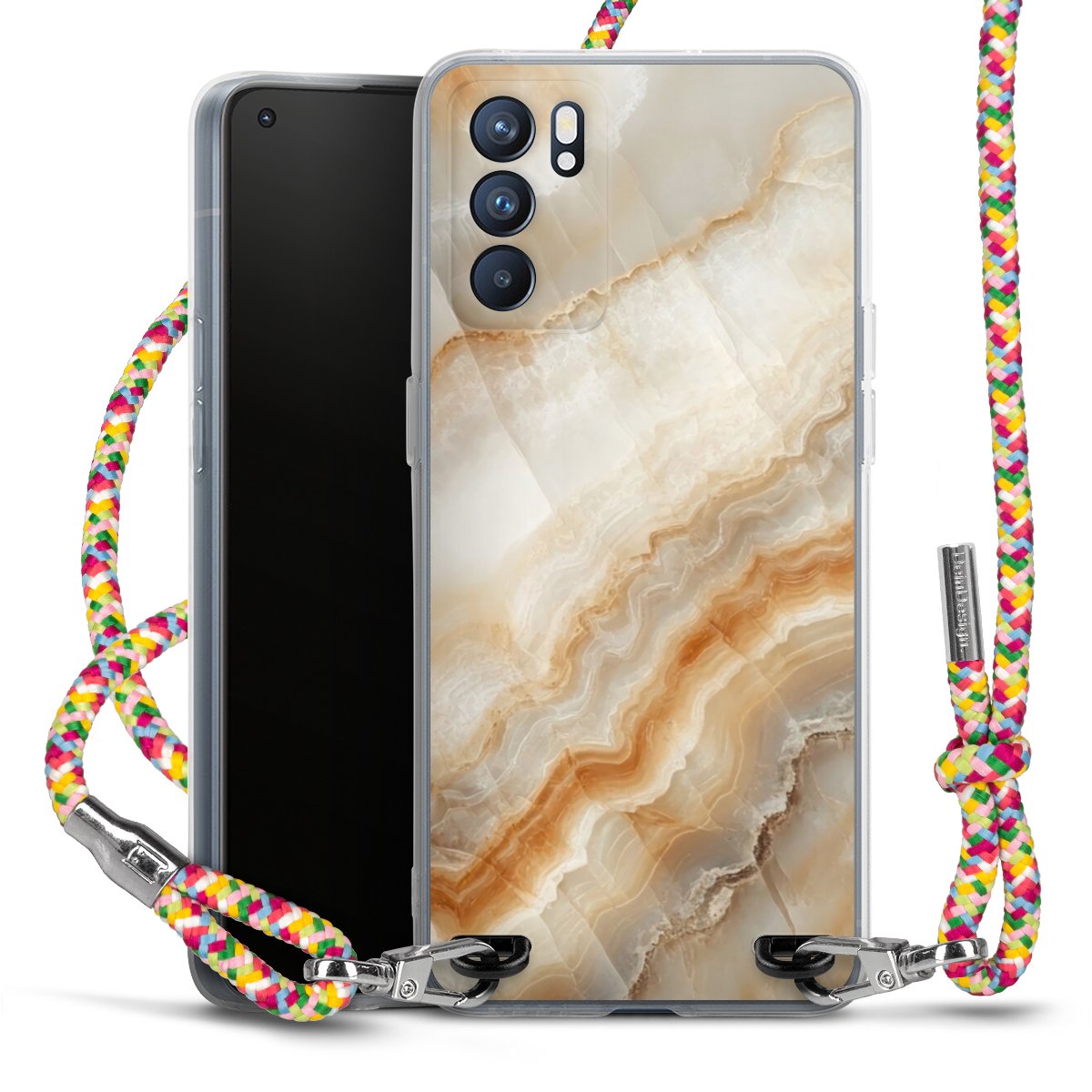 The flexible case is made from a highquality TPU material (thermoplastic Polyurethan). Thanks to its longlasting and break resistant characterisitcs, the case is flexible yet consistent in form and has a great grip and feel. The textile strap made from Polyester gives a chic yet casual accent allowing you to carry your phone like a bag or necklace - a practical gadget perfect for your next adventure. The textile strap is about 1.70 meters long and the length can easily be adjusted through the knots. Our Carry Case is available in Colourful, Mint-Camouflage, Very-Berry, Sahara-Sand and Sparkling-Neon. The ends of the textile strap are covered with metallic end caps to protect them against fraying.