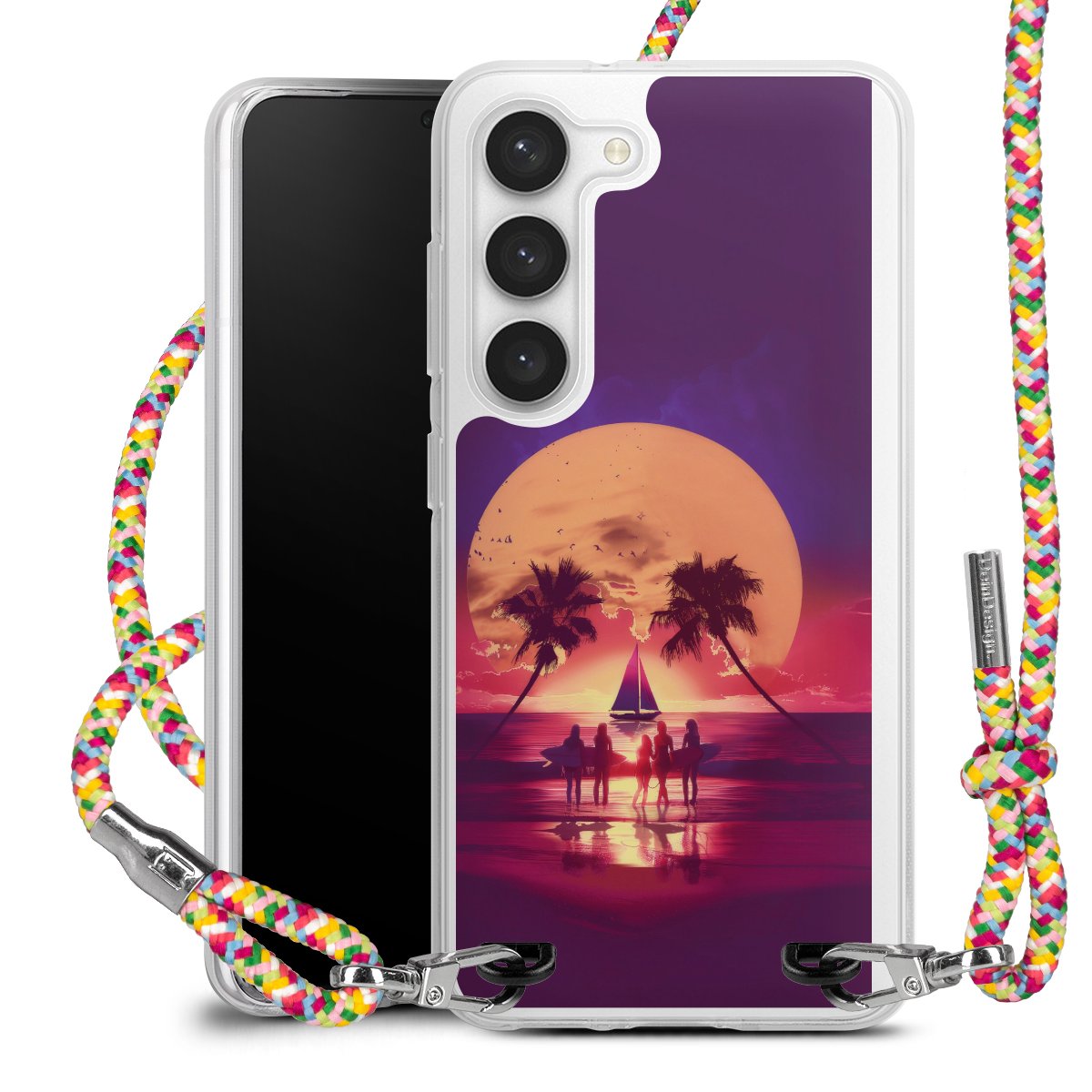 The flexible case is made from a highquality TPU material (thermoplastic Polyurethan). Thanks to its longlasting and break resistant characterisitcs, the case is flexible yet consistent in form and has a great grip and feel. The textile strap made from Polyester gives a chic yet casual accent allowing you to carry your phone like a bag or necklace - a practical gadget perfect for your next adventure. The textile strap is about 1.70 meters long and the length can easily be adjusted through the knots. Our Carry Case is available in Colourful, Mint-Camouflage, Very-Berry, Sahara-Sand and Sparkling-Neon. The ends of the textile strap are covered with metallic end caps to protect them against fraying.