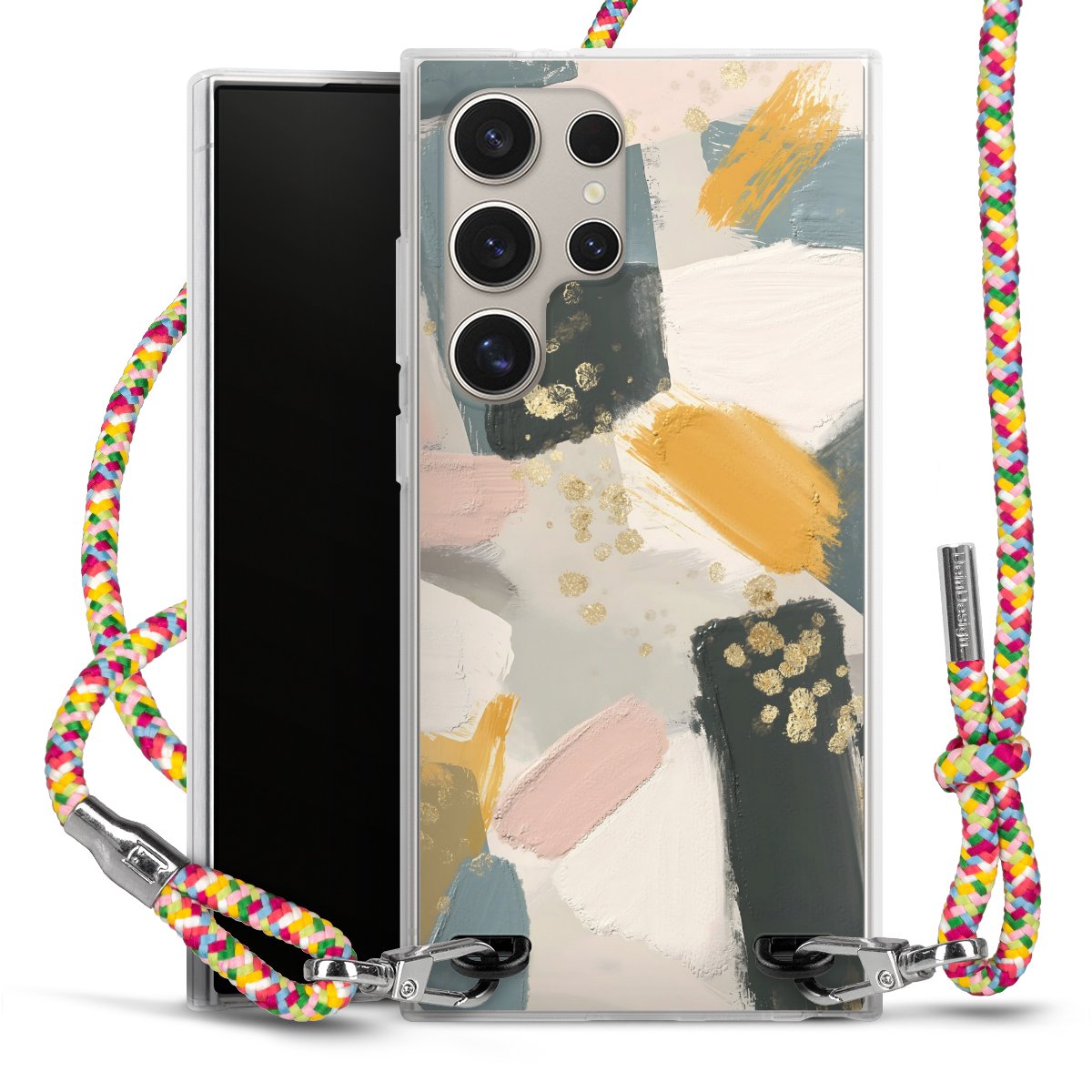 The flexible case is made from a highquality TPU material (thermoplastic Polyurethan). Thanks to its longlasting and break resistant characterisitcs, the case is flexible yet consistent in form and has a great grip and feel. The textile strap made from Polyester gives a chic yet casual accent allowing you to carry your phone like a bag or necklace - a practical gadget perfect for your next adventure. The textile strap is about 1.70 meters long and the length can easily be adjusted through the knots. Our Carry Case is available in Colourful, Mint-Camouflage, Very-Berry, Sahara-Sand and Sparkling-Neon. The ends of the textile strap are covered with metallic end caps to protect them against fraying.