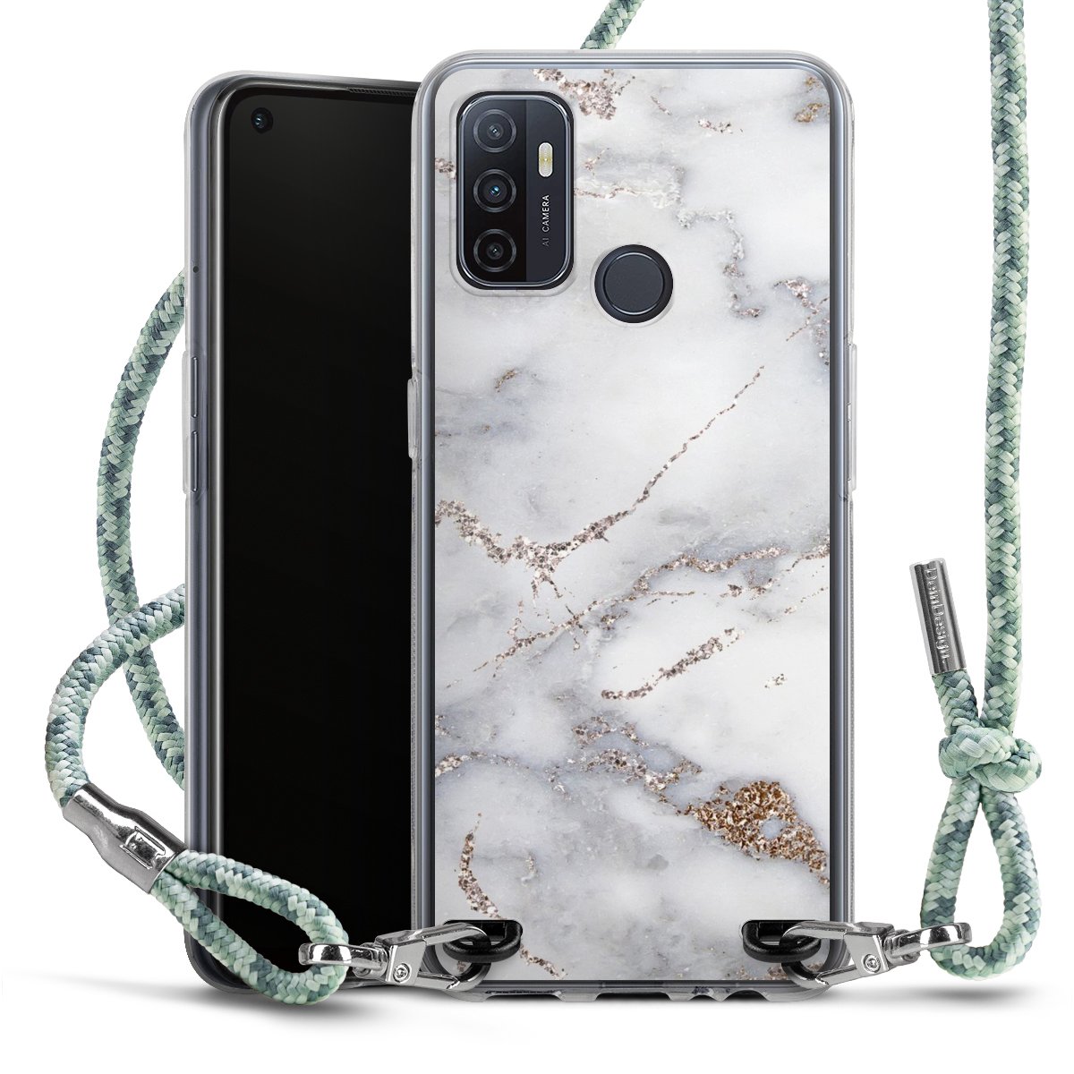 The flexible case is made from a highquality TPU material (thermoplastic Polyurethan). Thanks to its longlasting and break resistant characterisitcs, the case is flexible yet consistent in form and has a great grip and feel. The textile strap made from Polyester gives a chic yet casual accent allowing you to carry your phone like a bag or necklace - a practical gadget perfect for your next adventure. The textile strap is about 1.70 meters long and the length can easily be adjusted through the knots. Our Carry Case is available in Colourful, Mint-Camouflage, Very-Berry, Sahara-Sand and Sparkling-Neon. The ends of the textile strap are covered with metallic end caps to protect them against fraying.