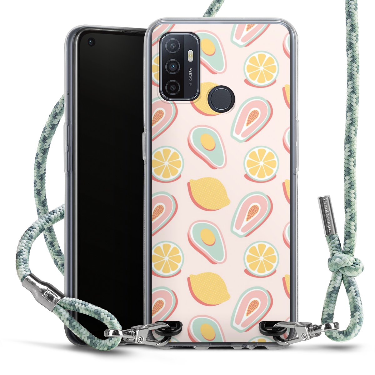 The flexible case is made from a highquality TPU material (thermoplastic Polyurethan). Thanks to its longlasting and break resistant characterisitcs, the case is flexible yet consistent in form and has a great grip and feel. The textile strap made from Polyester gives a chic yet casual accent allowing you to carry your phone like a bag or necklace - a practical gadget perfect for your next adventure. The textile strap is about 1.70 meters long and the length can easily be adjusted through the knots. Our Carry Case is available in Colourful, Mint-Camouflage, Very-Berry, Sahara-Sand and Sparkling-Neon. The ends of the textile strap are covered with metallic end caps to protect them against fraying.